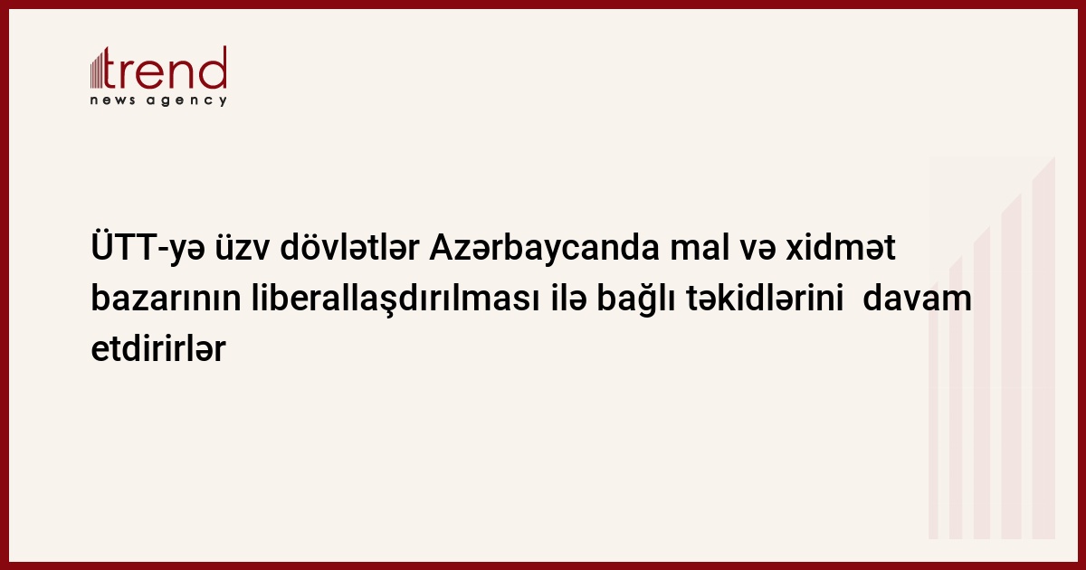 Azərbaycan, Bakı, 14 may / Trend , müxbir İ.Xəlilova/ Ümumdünya Ticarət Təşkilatına (ÜTT) üzv dövlətlər Azərbaycan tərəfindən ticarət rejimi və bazar xidmətlərinin liberallaşdırılması ilə bağlı təkidlərini davam etdirirlər. Bu barədə Danışıqlar qrupunun rəhbəri, Azərbaycanın xarici işlər nazirinin müavini Mahmud Məmmədquliyev bildirib. Xüsusilə, birbaşa filialların açılması vasitəsilə bank bazarına, 100 faizlik xarici kapital ilə törmə strukturların yaradılması yolu ilə ölkənin sığorta bazarına daxil olma üzrə tələblər qüvvədə qalmaqdadır.