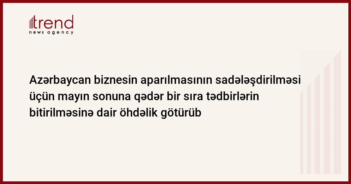 Azərbaycan, Bakı, 26 may/ Trend , müxbir İ.Xəlilova/ Azərbaycan hökuməti mayın sonunadək ölkədə tikinti biznesinin aparılmasının sadələşdirilməsi üzrə tədbiləri başa çatdırmaq niyyətindədir. Bu, AR-a, Dünya Bankı və Beynəlxalq Maliyyə Korporasiyasının sentyabrda açıqlanacaq "Doing Business 2008: İslahatları necə aparmalı" birgə hesabatında öz mövqeyini yaxşılaşdırmağa imkan verəcək. Bu barədə bazar ertəsi BMK-nın nümayəndəsi Aliyə Əzimova məlumat verib.