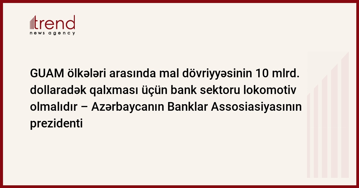 Azərbaycan, Bakı, 29 may / Trend , müxbir İ.Xəlilova / GUAM yeni inkişaf formatına daxil olub və Gürcüstan, Ukrayna, Azərbaycan və Moldovanın bank sektoru mal dövriyyəsinin 4 mlrd. dollardan 10 mlrd. dollaradək artması üzrə strateji məqsədlərə nail olmaq üçün lokomotiv olmalıdır. Bu barədə cümə axşamı Azərbaycanın Banklar Assosiasiyasının (ABA) prezidenti Eldar İsmayılov Bakıda bu ölkələrin bank cəmiyyətlərinin rəhbərləri və bank nümayəndələri ilə görüş zamanı bildirib.