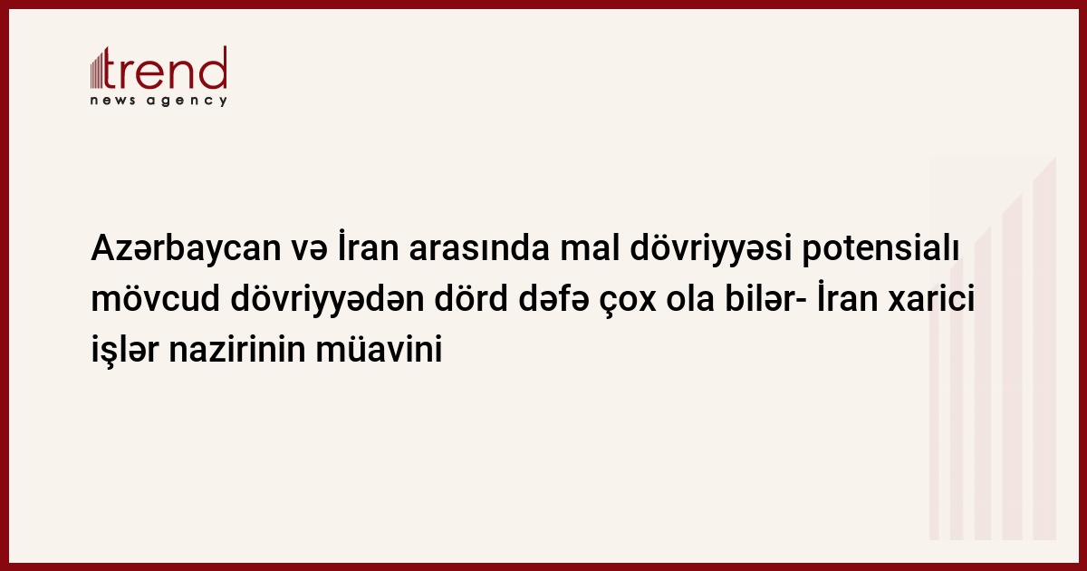 Azərbaycan, Bakı, 05 iyun/ Trend , müxbir Ü.İsmayılova/ Azərbaycan və İran arasında mal dövriyyəsinin potensial səviyyəsi hazırki $700 mln.-a qarşı $3 mlrd. təşkil edə bilər. Bu barədə cümə axşamı Bakıda, Azərbaycan-İran biznes-forumu zamanı İran xarici işlər nazirinin müavini Əlirza Əttar məlumat verib.
