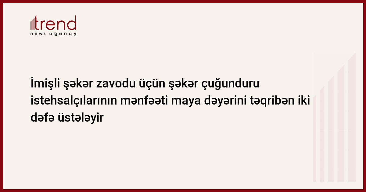 Azərbaycan, Bakı, 12 iyul / Trend , E.İsmayılov/ Azərbaycanda şəkər çuğunduru istehsalçılarının mənfəəti (İmişli şəkər zavodu tədarükçüləri) , hektara görə, 1000-1700 manat aralığında dəyişir. Bu barədə İmişli şəkər zavodundan bildiriblər. Çuğundurun becərilməsinə sərf olunan xərclər, torpağın bir hektarına görə, 800 manat təşkil edir.