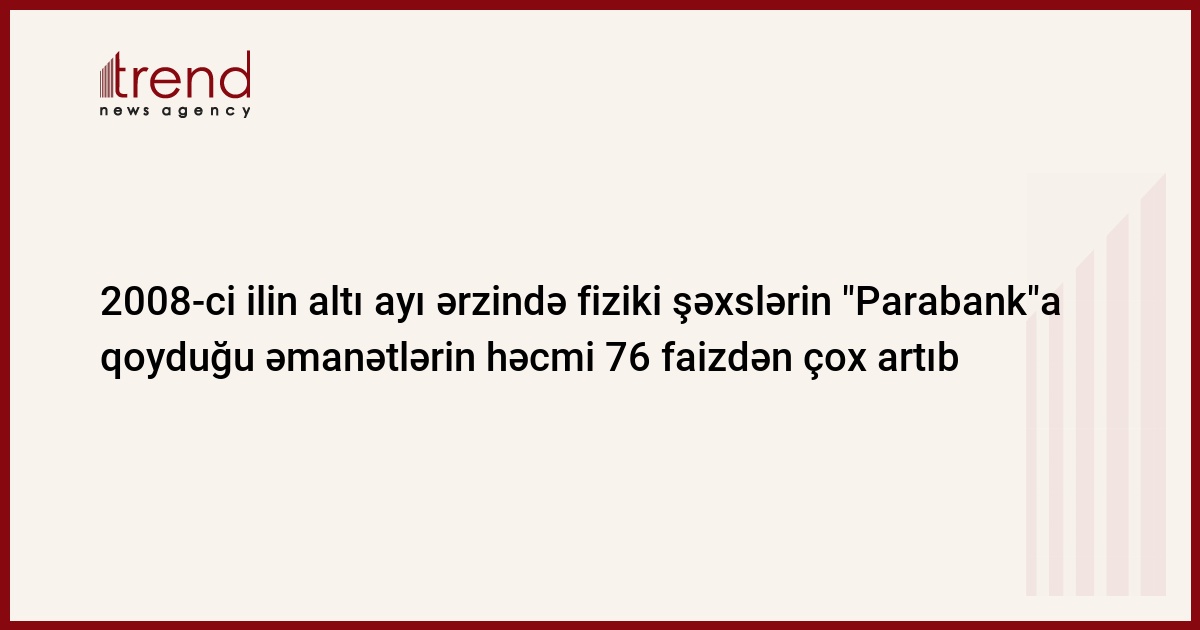 Azərbaycan, Bakı, 24 iyul / Trend / Fiziki şəxslərin "Parabank" ASC-yə qoyduğu əmanətlərin həcmi 2008-ci ilin əvvəli ilə müqayisədə 76,7 faiz artıb, - bankın cümə axşamı yaydığı bəyanatda deyilir. Bu göstərici son ildə iki dəfədən çox artıb və 2008-ci il iyulun 1-nə 27,3 mln. manat təşkil edib.