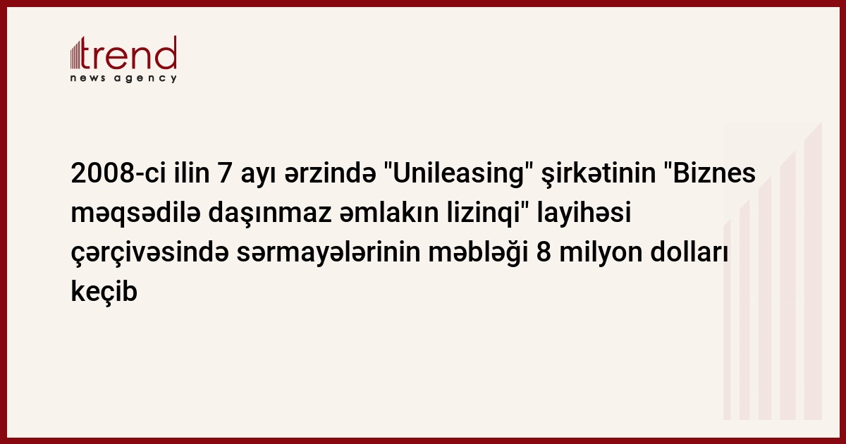 Azərbaycan, Bakı, 11 avqust/ Trend / 2008-ci il avqustun 1-nə olan məlumatlara əsasən, "Unileasing" Lizinq Şirkəti QSC biznes məqsədilə daşınmaz əmlak bazarının inkişafına $8 milyondan artıq sərmayə yatırıb, - bazar ertəsi şirkətin yaydığı məlumatda deyilir.