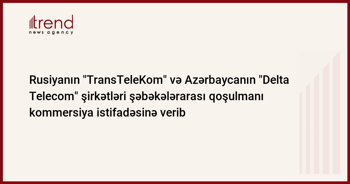 Azərbaycan, Bakı, 02 sentyabr / Trend , müxbir S.Babayeva/ Rusiyanın "TransTeleKom" Qapalı tipli Səhmdar Cəmiyyəti (TTK) və Azərbaycanın "Delta Telecom" şirkəti Samur-Yalama rayonundakı Rusiya-Azərbaycan sərhəd keçidində şəbəkələrarası qoşulmanı kommersiya istismarına veriblər. TTK-nın məlumatında bildrilir ki, layihə çərçivəsində "TransTeleKom" şirkəti "Delta Telecom"a 622 Mbit/s səviyyəsində IP-Access xidməti təqdim edib.