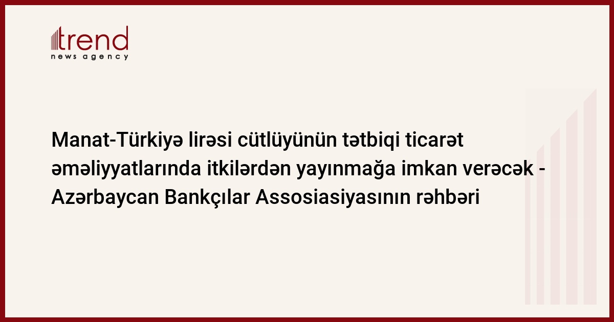 Azərbaycan, Bakı, 12 sentyabr / Trend , müxbir İ.Xəlilova/ "Azərbaycan və Türkiyə arasında manat-lirə birbaşa valyutalarında ticarət əməliyyatlarını aparmaq üçün zəmin yaranıb", - cümə günü Azərbaycan Bankçılar Assosiasiyasının (ABA) prezidenti Eldar İsmayılov Türkiyə Bankçılar Assosiasiyalarının Baş katibi Ekrem Keskinin rəhbərlik etdiyi nümayəndə heyəti ilə görüşdə deyib.