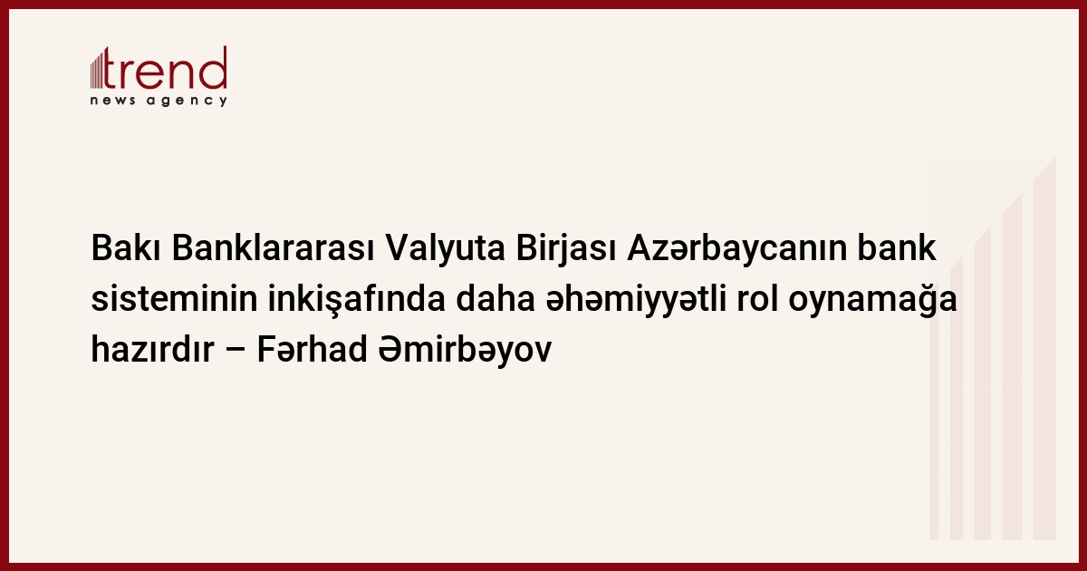 Trend BBVB QTSC-nin rəhbəri Fərhad Əmirbəyovdan Bakı Banklararası Valyuta Birjasının fəaliyyəti və birja ticarətinin perspektivləri ilə bağlı sualları cavablandırmağı xahiş edib.