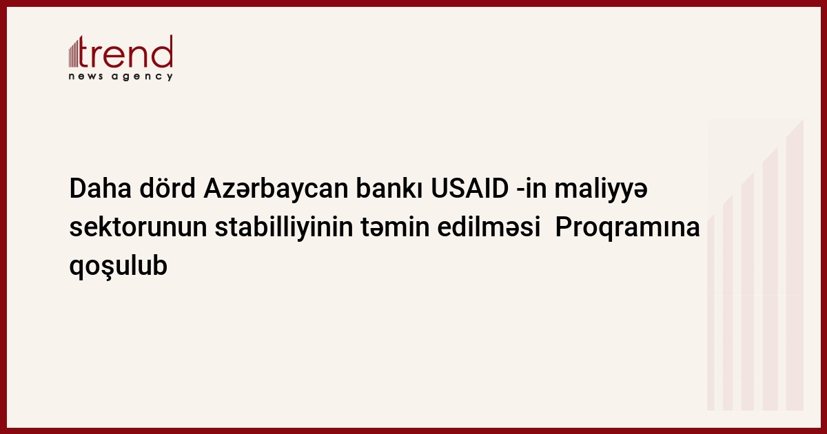 Azərbaycan, Bakı, 19 sentyabr / Trend , müxbir N.İsmayılova/ Cümə günü Amerikanın "Bankworld" təşkilatı daha dörd Azərbaycan bankı - "Mugan Bank", "Azdemiryolbank", "NBC Bank" və "Royal Bank of Baku" ilə ABŞ - ın Beynəlxalq İnkişaf Agentliyinin (USAID) "maliyyə sektorunun stabilliyi" (FSSP) Proqramına qoşulması barədə memorandum imzalayıb.