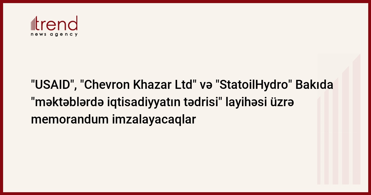 Azərbaycan, Bakı, 26 sentyabr / Trend / Şənbə günü ABŞ - ın Beynəlxalq İnkişaf Agentliyi (USAID), "Chevron Khazar Ltd" və "StatoilHydro" şirkətləri Azərbaycan paytaxtında qarşılıqlı anlaşma memorandumu imzalayacaq. Bu barədə USAID - in cümə günü yayılan məlumatında bildirilir.