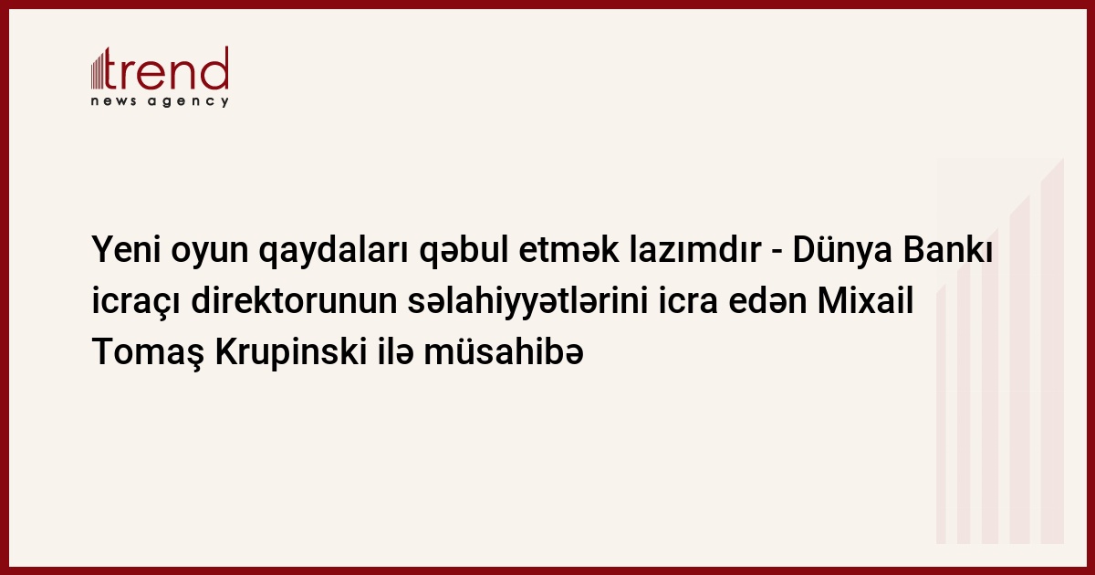 Budapeşt, Macarıstan, 29 oktyabr/ Trend , müxbir S.Əliyev/ Dünya Bankının Azərbaycan, Qırğızıstan, Polşa, Serbiya, İsveçrə, Tacikistan, Türkmənistan və Özbəkistan üzrə icraçı direktorunun səlahiyyətlərini icra edən Mixail Tomaş Krupinski ilə müsahibə (Michal Tomasz Krupinski).