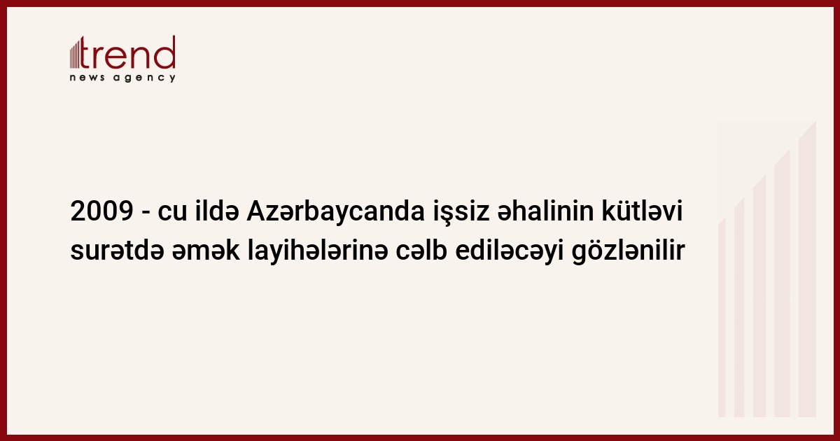 Maliyyə böhranı ilə əlaqədar dünya bazarlarında yaranmış mənfi tendensiyalar 2009-cu ildə Azərbaycanın əmək bazarına toxunmayacaq. Əksinə, biz işsiz əhalinin müvəqqəti xarakterli əmək layihələrinə kütləvi surətdə cəlb edilməsinin şahidi olacağıq.