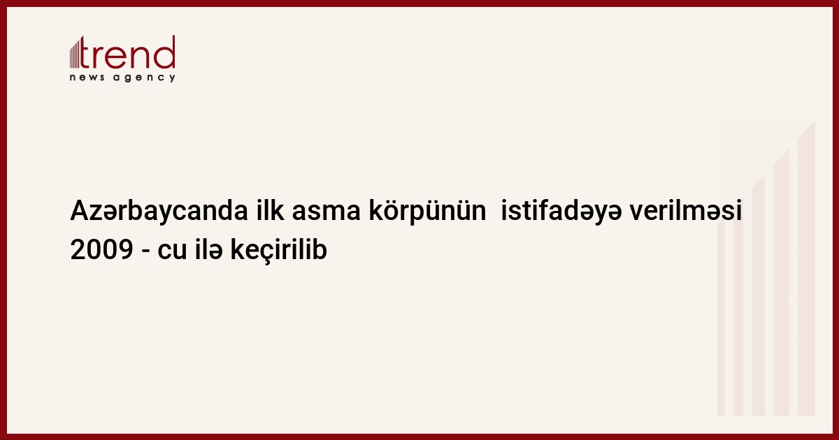 Azərbaycan, Bakı, 24 noyabr/ Trend , müxbir E.İsmayılov / Zaqatala şəhərinin mərkəzində Talaçay çayı üzərində tikilən Azərbaycanda ilk asma körpü 2009 - cu ilin birinci yarısında istifadəyə veriləcək. Bu barədə bazar ertəsi Azərbaycan Nəqliyyat Nazirliyindən bildiriblər. Əvvəllər körpünün 2008 - ciilin sonunadək istismara verilməsi planlaşdırılırdı.