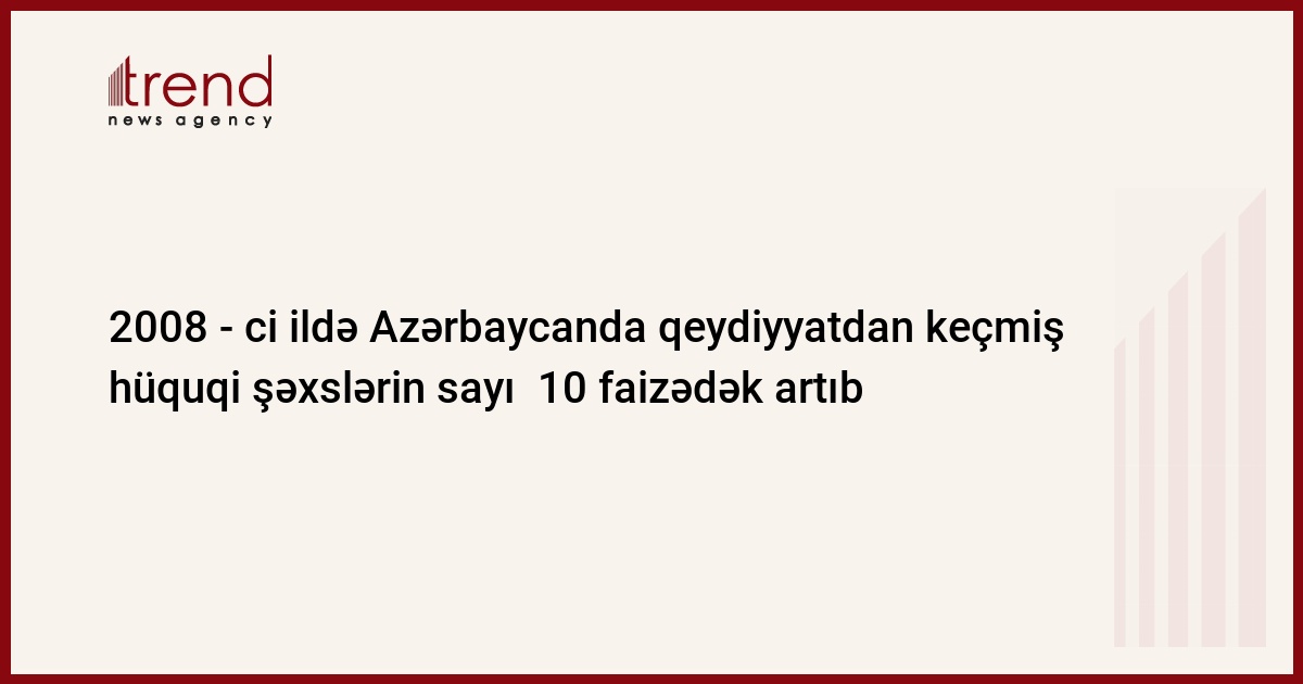 2008 - ci il ərzində Azərbaycanda qeydiyyatdan keçmiş hüquqi şəxslərin sayı 8,8 faiz artıb və 2009 - cu il yanvarın 1- nə 86 117 təşkil edib, - Dövlət Statistika Komitəsindən bildiriblər. Hesabat dövründə 6 867 yeni müəssisə yaradılıb, 440 müəssisə və təşkilat fəaliyyətini dayandırıb.