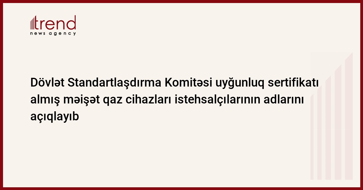Azərbaycanın Standartlaşdırma, Metrologiya və Patent üzrə Dövlət Komitəsi uyğunluq sertifikatı almış məişət qaz cihazları istehsalçılarının adlarını açıqlayıb.