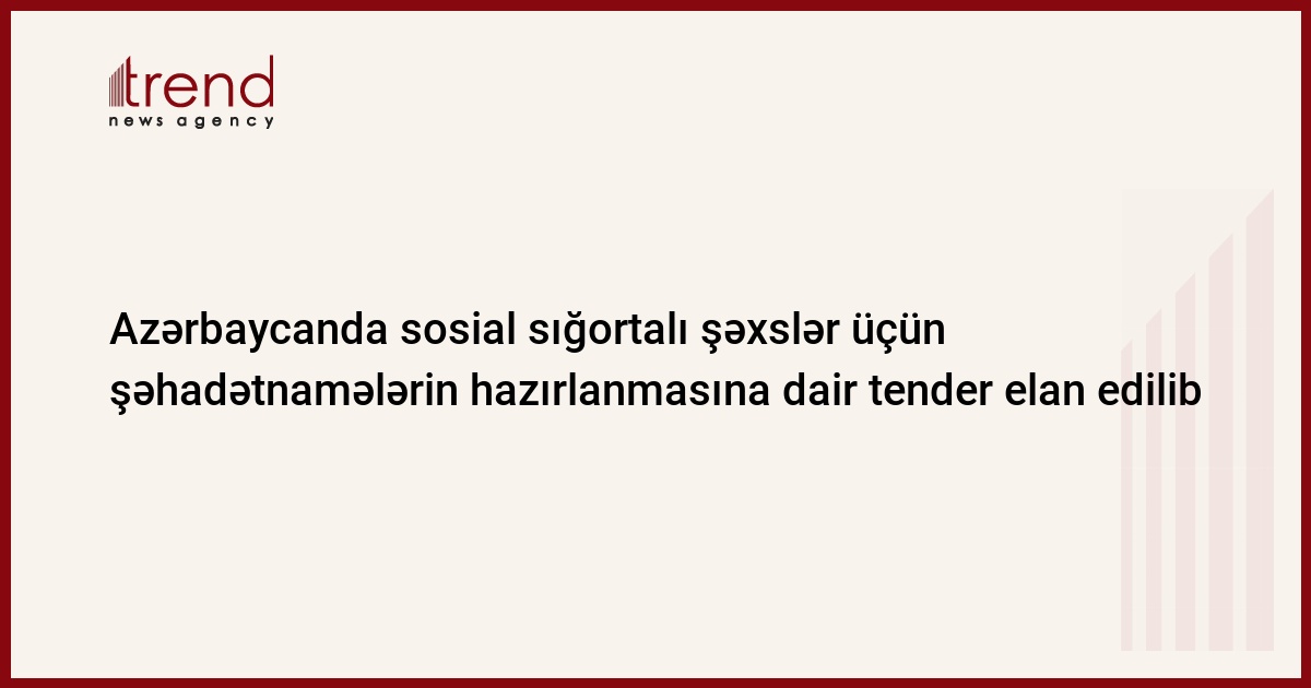 Rəsmi mətbuatın verdiyi xəbərə görə, Azərbaycan Dövlət Sosial Müdafiə Fondu sosial sığortlə şəxslər üçün şəhadətnamələrin hazırlanmasına dair tender elan edib. Tenderdə iştirakın dəyəri 200 manat təşkil edir.