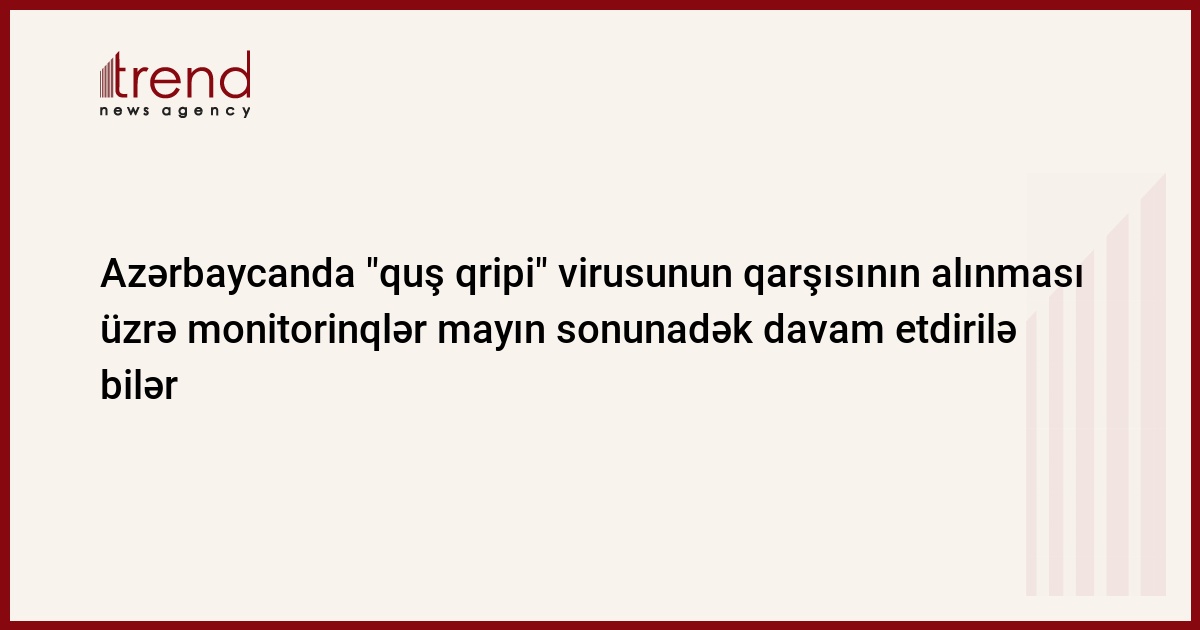 Azərbaycan, Bakı, 26 fevral / Trend , müxbir S.Babayeva / Azərbaycanda "quş qripi" virusunun qarşısının alınması üzrə monitorinqlər mayın sonunadək davam etdirilə bilər. Bu barədə ölkənin Kənd Təsərrüfatı Nazirliyi yanında Dövlət Baytarlıq Xidmətinin müdiri İsmayıl Həsənov bildirib.