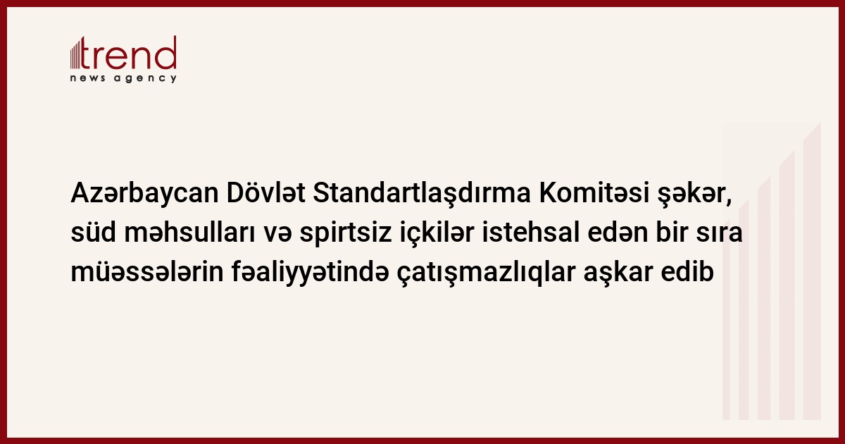 Azərbaycanın Standartlaşdırma, Metrologiya və Patent üzrə Dövlət Komitəsi şəkər, süd məhsulları və spirtsiz içkilərin istehsalı ilə məşğul olan beş müəssisənin fəaliyyətində ciddi çatışmazlıqlar aşkar edib.