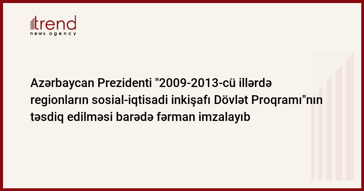 Azərbaycan Prezidenti İlham Əliyev ölkədə iqtisadiyyatın diversifikasiyasına və onun dünya təsərrüfat sisteminə səmərəli inteqrasiyasına, infrastruktur və kommunal xidmətlərin səviyyəsinin daha da yaxşılaşdırılmasına, əhalinin həyat səviyyəsinin davamlı olaraq yüksəldilməsinə nail olmaq məqsədi ilə "Azərbaycan Respublikası regionlarının 2009-2013-cü illərdə sosial-iqtisadi inkişafı Dövlət Proqramı"nın təsdiq ediməsi barədə fərman imzalayıb. Məlumatı AzərTAc Dövlət İnformasiya Agentliyi yayıb.