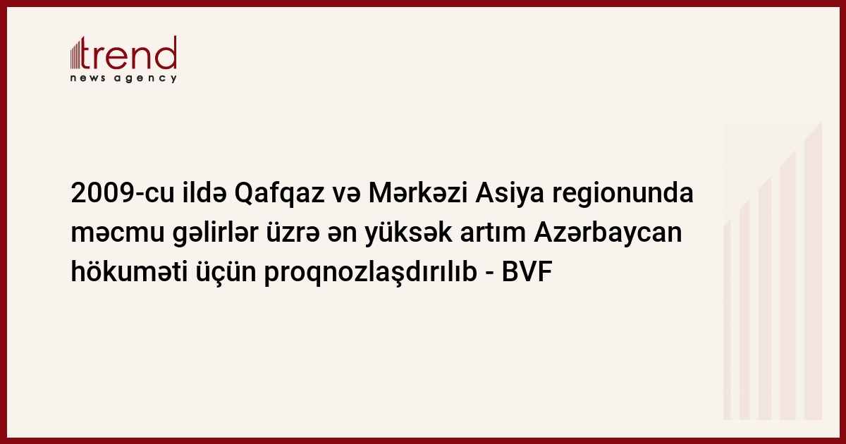 "Beynəlxalq Valyuta Fondu (BVF) 2009-cu ildə Qafqaz və Mərkəzi Asiya regionunda məcmu gəlirlər üzrə ən yüksək artımı Azərbaycan hökuməti üçün proqnozlaşdırıb - ÜDM-in 42,9 faizi", - BVF-in öz rəsmi saytında yerləşdirdiyi may ayı üçün regional iqtisadi icmalda deyilir.