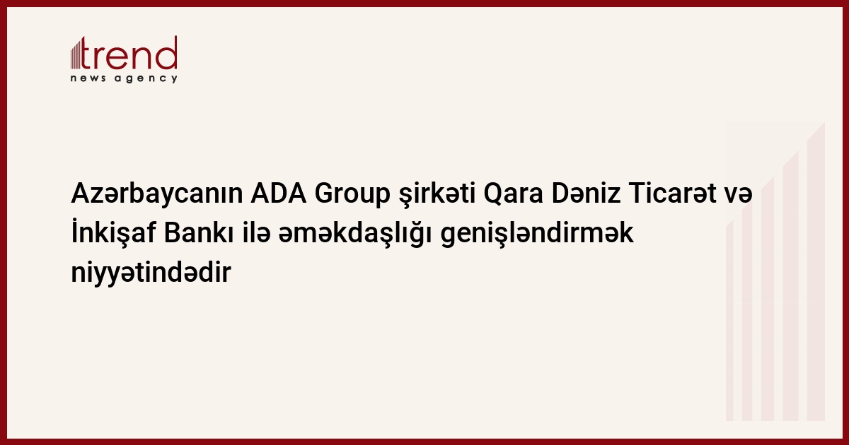 Qara Dəniz Ticarət və İnkişaf Bankı rəhbərliyinin dəvəti ilə Azərbaycanın ADA Şirkətlər Qrupunun nümayəndə heyəti iyun ayının 14-də Yunanıstanın Saloniki şəhərində Bankın 10 illiyinə həsr olunmuş tədbirlərdə iştirak edəcək.
