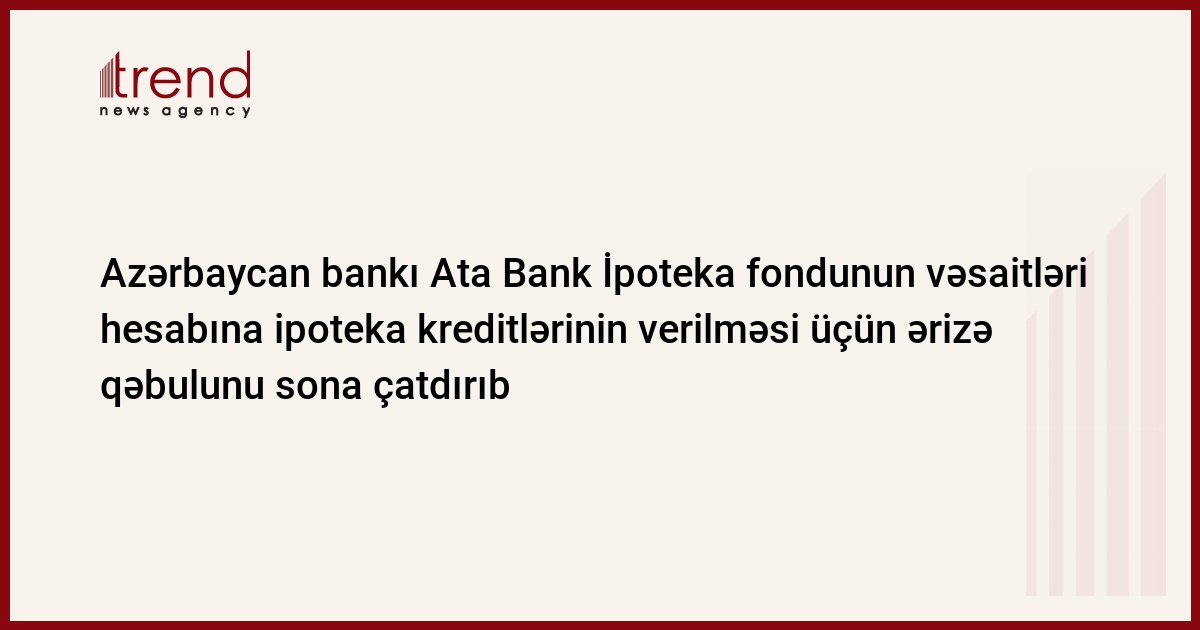 Azərbaycan bankı Ata Bank ölkənin Mərkəzi Bankı yanında fəaliyyət göstərən İpoteka Fondunun (AİF) vəsaitləri hesabına ipoteka kreditlərinin verilməsi üçün ərizə qəbulunu sona çatdırıb və tezliklə onların verilməsinə başlanacaq, cümə axşamı bankdan bildirilib.