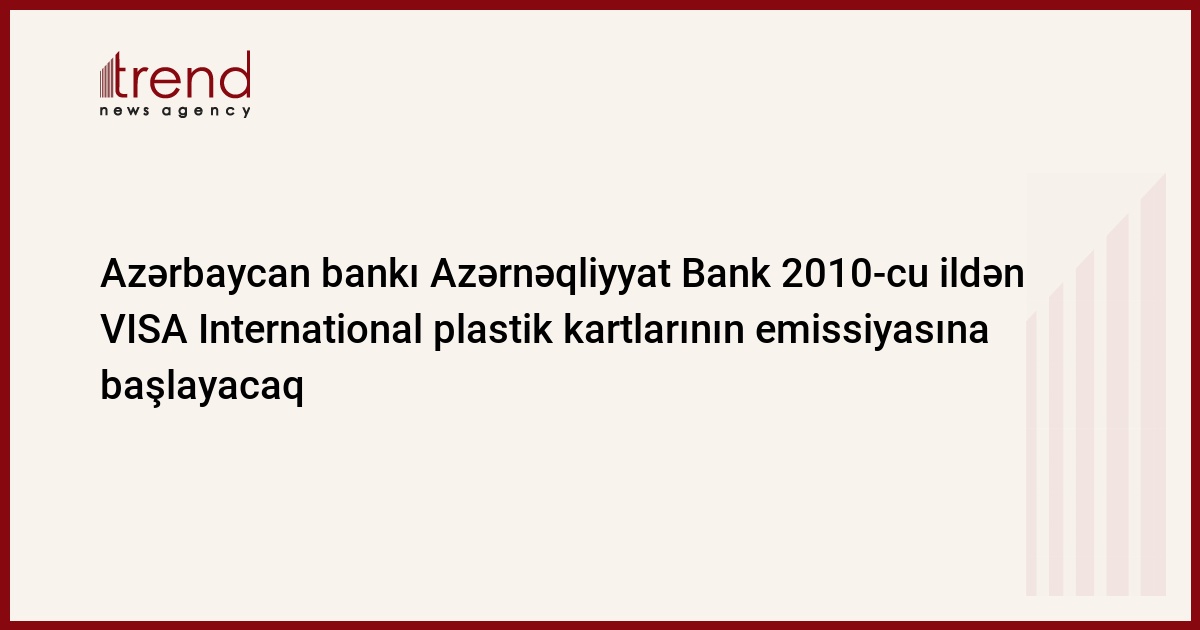 Azərbaycan bankı Azərnəqliyyat Bank 2010-cu ildən VISA International beynəlxalq ödəmə sisteminin plastik kartlarının emissiyasına başlayacaq. Bu barədə bankdan deyilib.