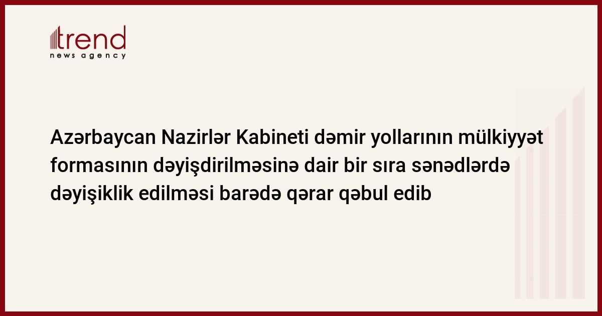 Azərbaycan Nazirlər Kabineti "Azərbvaycan Dövlət Dəmir Yolları"nın (hazırda "Azərbaycan Dəmir Yolları" QSC) mülkiyyət formasının dəyişdirilməsi ilə əlaqədar olaraq bir sıra sənədlərə dəyişiklik edilməsi barədə qərarı təsdiq edib. Bu barədə Nazirlər Kabinetinin rəsmi saytında yer alan qərarda deyilir.