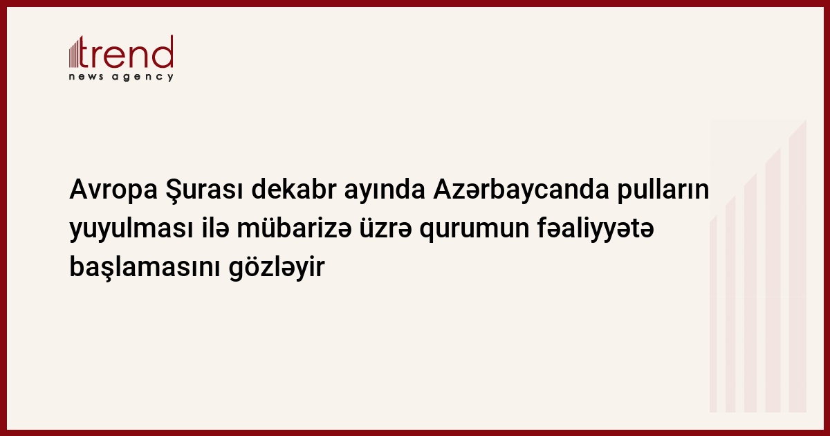Avropa Şurasının "Moneyval" ekspert qrupu (çirkli pulların yuyulmasına qarşı tədbirlərin qiymətləndirilməsi üzrə) dekabr ayında Azərbaycanda pulların yuyulması ilə mübarizə üzrə qurumun fəaliyyətə başlamasını gözləyir. Bu barədə AŞ-nin rəsmi saytında yerləşdirilən məlumatda deyilir.