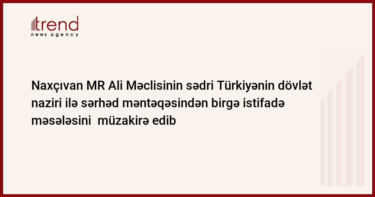 Naxçıvan Muxtar Respublikası Ali Məclisinin sədri Vasif Talıbov çərşənbə axşamı Ankarada Türkiyənin dövlət naziri Həyati Yazıcı ilə Naxçıvan MR və Türkiyə sərhədindəki gömrük məntəqəsindən birgə istifadəni müzakirə edib. Bu barədə "Anadolu" agentliyi məlumat yayıb.