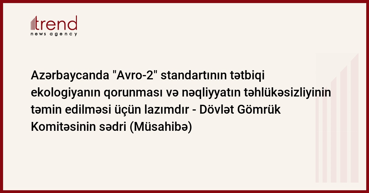 - Cari ilin iyulun 1-dən etibarən, Azərbaycan hökumətinin qərarı əsasında, Azərbaycan "Avro-2" ekoloji standartlarına keçir. Bu o deməkdir ki, ölkəyə gətirilən avtomobillərin keyfiyyət standartları gömrükdə yoxlanılacaq. İstər nəqliyyat vasitələrinin və yolların təhlükəsizliyi, istərsə də ilk növbədə, ekologiyanın, ətraf mühitin qorunması baxımından "Avro-2" standartlarının tətbiqi zəruridir. Bu həm də istifadə olunacaq yanacağın, ümumiyyətlə, maşınların özünün quruluşunun "Avro-2" standartlarına uyğunlaşdırılması deməkdir. Bununla bağlı tətbiq olunacaq məhdudiyyətlərə gəldikdə, qeyd edim ki, biz ölkələr üzrə maşınların buraxılış ilini götürürük. Burada əsas diqqət ona yetiriləcək ki, maşınların buraxılış ilinə və onların ölkəyə idxalına icazə verilsin.