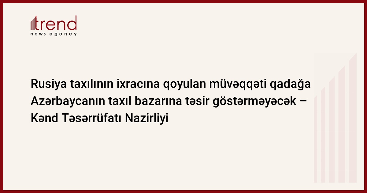 Rusiya hökuməti tərəfindən cümə axşamı taxılın ixracına tətbiq edilən müvəqqəti qadağa Azərbaycanın daxili taxıl bazarında qiymət artımına təsir göstərməyəcək. Bu barədə cümə günü Kənd Təsərrüfatı Nazirliyinin Bitkiçilik məhsullarının istehsalı, emalı və torpaqdan istifadəyə nəzarət şöbəsinin müdiri Sabir Vəliyev bildirib.