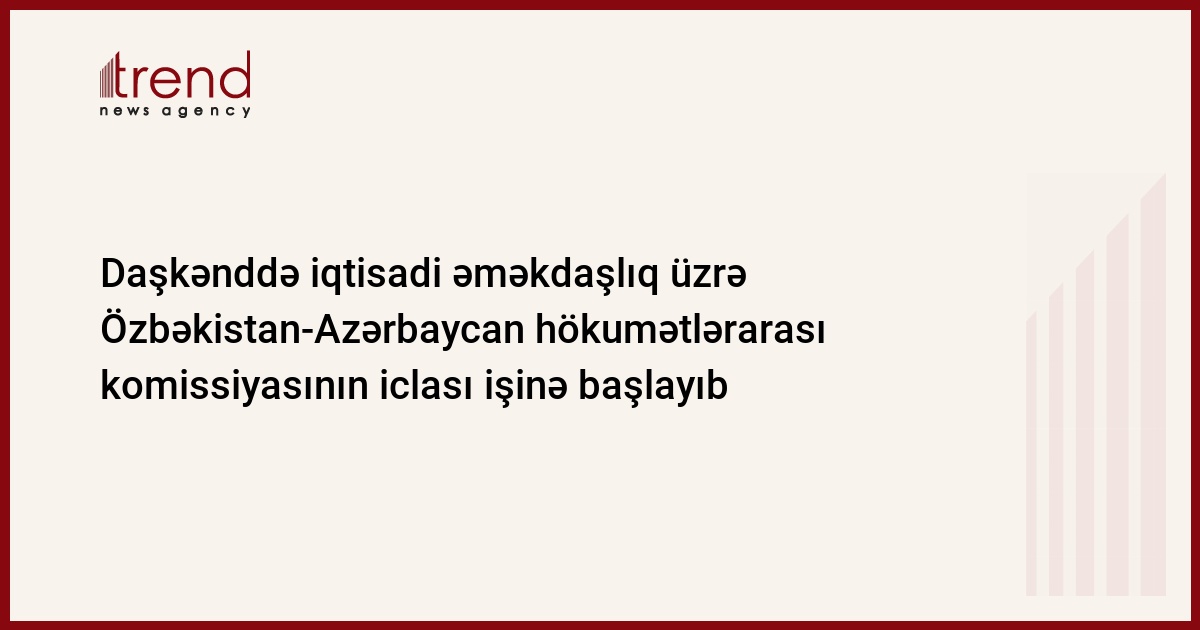 Çərşənbə axşamı Daşkənddə iqtisadi əməkdaşlıq üzrə Özbəkistan-Azərbaycan hökumətlərarası komissiyasının doqquzuncu iclası işinə başlayıb. İclas çərçivəsində Özbəkistan-Azərbaycan ikitərəfli ticari-iqtisadi əməkdaşlığının genişləndirilməsi üzrə ümumi məsələlərin müzakirəsi planlaşdırılıb.