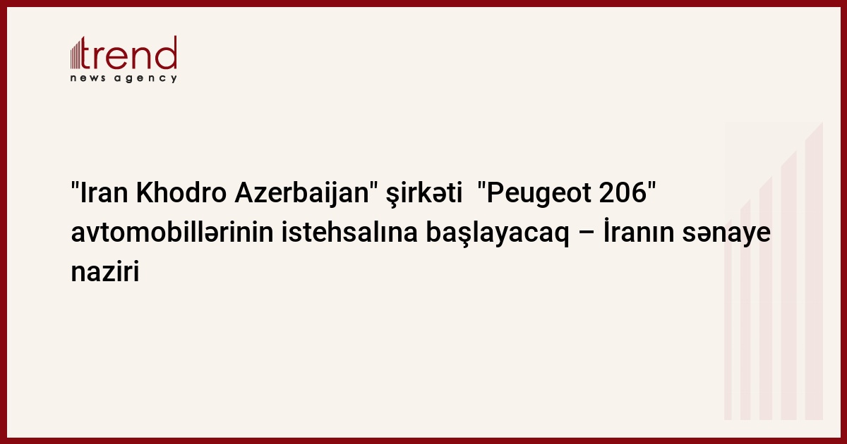 İranda - Şərqi Azərbaycan vilayətində yerləşən "Iran Khodro Azerbaijan" maşınqayırma şirkətinin nümayəndəliyi 2011-ci ilin fevralından "Peugeot 206" avtomobillərinin istehsalına başlayacaq. Bu barədə İranın sənaye naziri Əkbər Mehribaniyan məlumat verir. Xəbəri cümə günü Fars agentliyi yayıb.