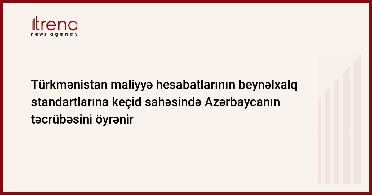 Türkmənistan Maliyyə Nazirliyinin əməkdaşları bildiriblər ki, MDB ölkələri arasında mühasibat uçotu sahəsində maliyyə hesabatlarının beynəlxalq standartlarına keçidlə bağlı Azərbaycanın əldə etdiyi nailiyyətlər daha uğurlu hesab olunduğundan təcrübə mübadiləsi məqsədilə məhz Azərbaycan seçilib.