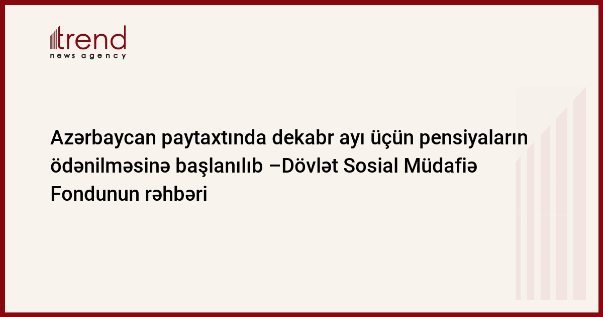 Azərbaycan Dövlət Sosial Müdafiə Fondu (DSMF) Bakı şəhərində dekabr ayı üzrə pensiya vəsaitlərinin köçürülməsinə başlayıb. Bu barədə fondun rəhəbri Səlim Müslümov bazar günü bildirib.