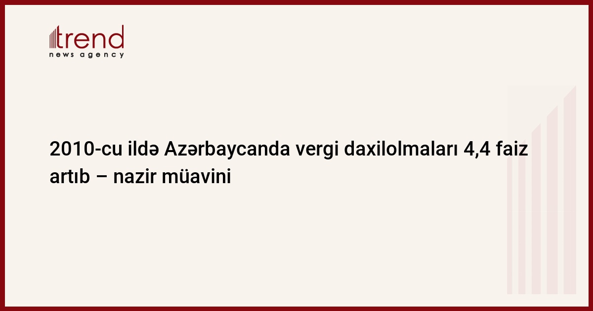 2010-cu ildə Azərbaycanda dövlət büdcəsinə vergi daxilolmaları 4,294 milyard manat təşkil edib ki, bu da inişilki yığımları 4,4 faiz və ya 180,6 milyon manat ötür. Trend-in məlumatına görə, bu barədə çərşənbə axşamı vergilər nazirinin birinci müavini Natiq Əmirov ötən ilin yekunlarına həsr edilən mətbuat konfransında deyib.