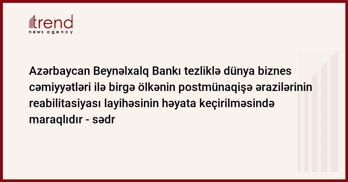 Azərbaycan Beynəlxalq Bankı ölkənin daxilində və ya xaricindəki bütün işgüzar dairələrlə yanaşı Azərbaycanın postmünaqişə ərazilərinin reabilitasiyası layihəsinin həyata keçirilməsində maraqlıdır. Bu barədə çərşənbə günü Londonda azərbaycanlı müəlliflərin "Azərbaycanın postmünaqişə ərazilərinin reabilitasiyasının konseptual əsasları" kitabının təqdimatında bankın sədri Cahangir Hacıyev bildirib.