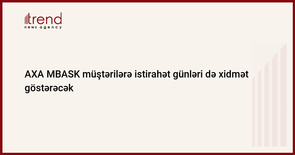 AXA MBASK Sığorta Şirkəti, bundan əvvəl bəyan olunmuş "müştərilərə xidmət göstərilməsinə yeni yanaşma" prinsipini həyata keçirərək, özünün Həzi Aslanov küçəsi, 80/9 ünvanında yerləşən Bakı Ofisini yeni - istirahət günləri olmayan iş rejiminə keçirir. İndi şirkətin müştəriləri onlar üçün əlverişli olan istənilən gün, yəni şənbə və bazar günləri də daxil olmaqla, sığorta müqaviləsi bağlaya və ya müqavilə üzrə ödəniş yerinə yetirə bilər. Bu barədə şirkətin bazar ertəsi yaydığı məlumatda deyilir.