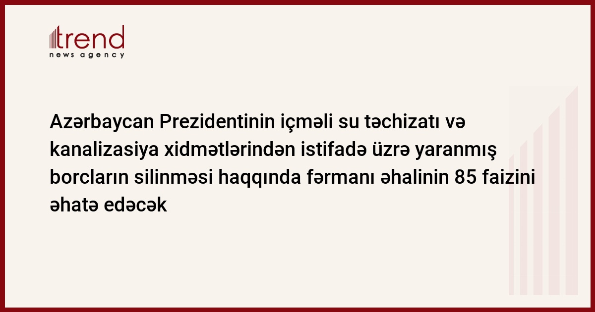 Aprelin 8-də Azərbaycan Prezidenti İlham Əliyev əhalinin içməli su təchizatı və kanalizasiya xidmətlərindən istifadəsi üzrə yaranmış borcların silinməsi haqqında fərman imzalayıb.