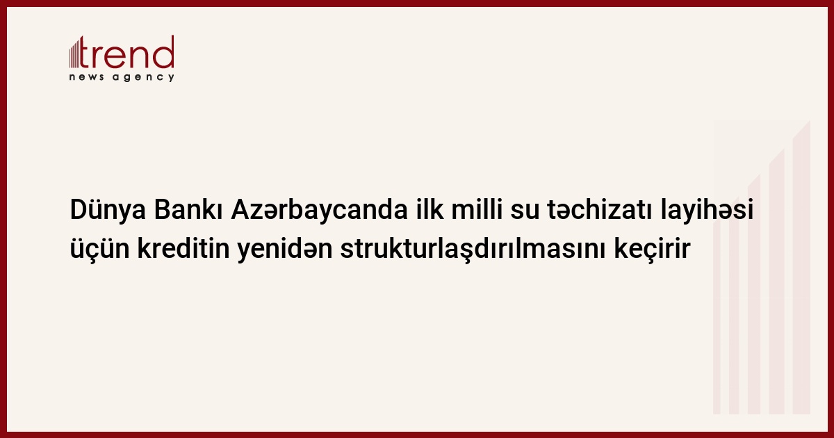 Dünya Bankı (DB) su təchizatı və kanalizasiya üzrə ilk milli layihə (National water supply and sanitation project) üçün kreditin yenidən strukturlaşdırılmasını keçirir. Bu barədə cümə axşamı Trend-ə bankın Bakı nümayəndəliyindən məlumat verilib.