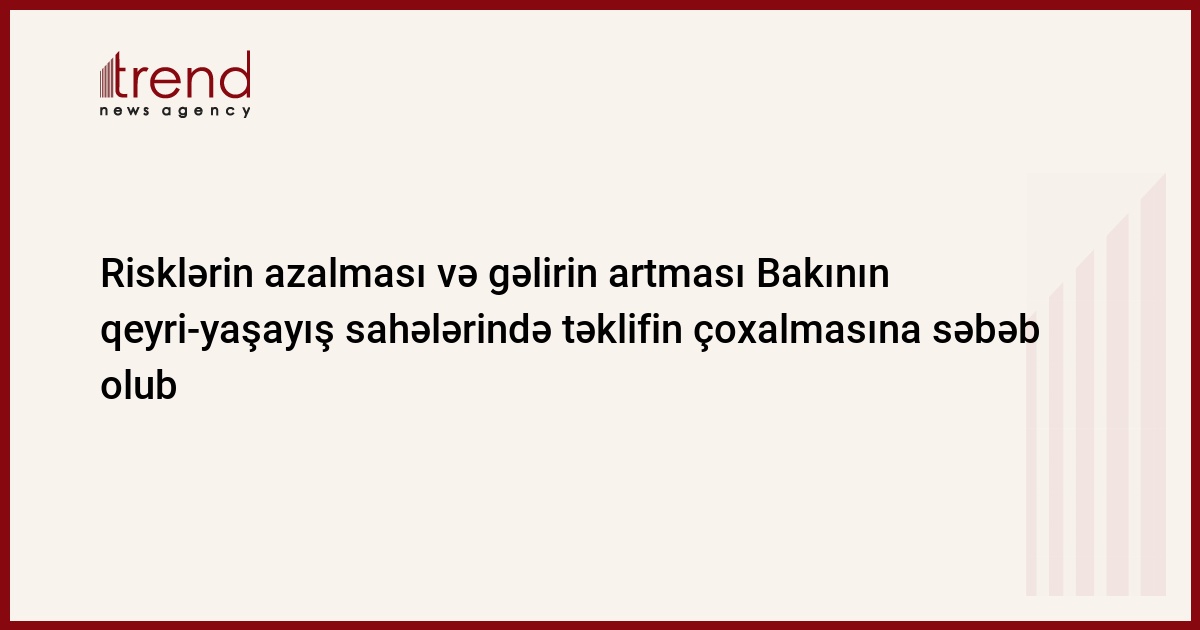 "Təklifin artmasının əsas səbəbi bu seqment üzrə gəlir əmsalının artması və risklərin azalmasıdır. Bu isə bazara tədricən yeni qeyri-yaşayış obyektlərinin daxil olmasına gətirib çıxarır", - təşkilatın ekspertləri hesab edirlər.