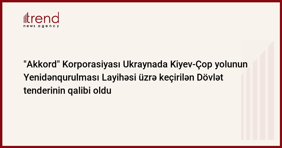 Azərbaycanın "Akkord Sənayə Tikinti İnvestisiya Korporasiyası" ASC İtaliya şirkətləri ilə yaradılmış konsorsiumla Ukraynanın Avtomobil Yolları Dövlət Xidmətinin M06 Kiyev-Çop yolunun əsaslı bərpası layihəsi üzrə tenderin qalib elan edilib. Trend-in məlumatına görə, bu barədə ASC-nin cümə axşamı yaydığı məlumatda deyilir.