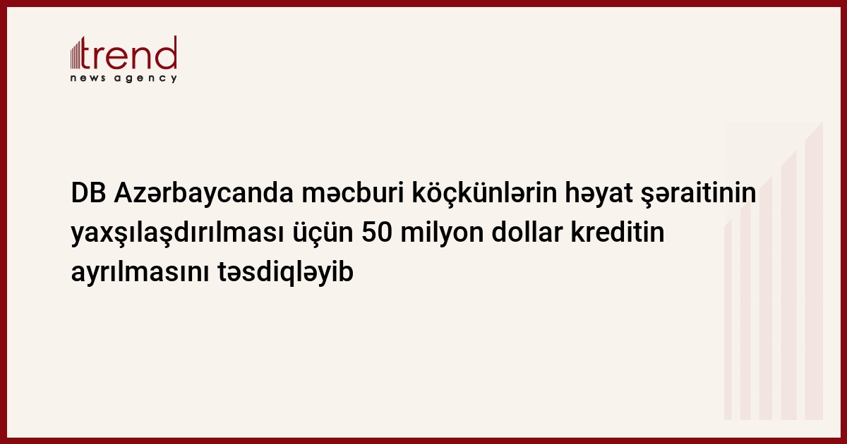 Dünya Bankının (DB) Direktorlar Şurası Beynəlxalq Yenidənqurma və İnkişaf Bankı (BYİB) tərəfindən Azərbaycana məcburi köçkünlərin həyat şəraitinin yaxşılaşdırılması layihəsinin reallaşdırılması üçün 50 milyon dollar məbləğində kredit xəttinin ayrılmasını təsdiqləyib. Trend-in məlumatına görə, bu barədə bankın məlumatında deyilir.