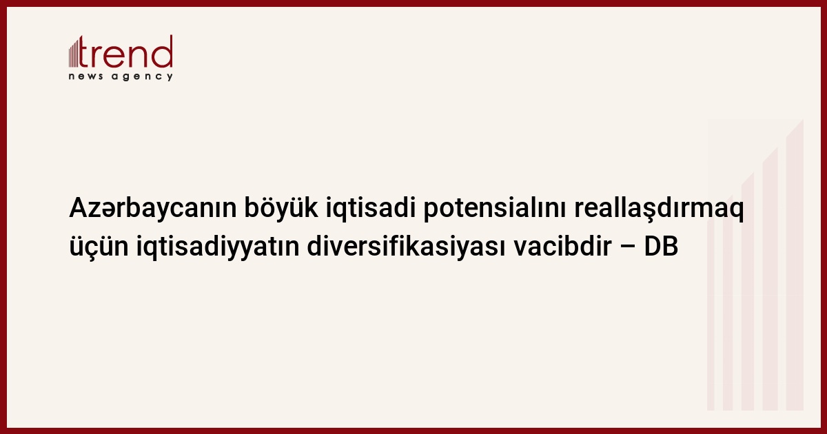 Azərbaycanın böyük iqtisadi potensialını reallaşdırmaq üçün iqtisadiyyatın diversifikasiyası çox vacibdir. Trend-in məlumatına görə, bu barədə bazar ertəsi Dünya Bankının (DB) Avropa və Mərkəzi Asiya regionunda strategiya və layihələr üzrə direktoru Teodor Alers Bakıda iqtisadi siyasət üzrə forumda deyib.