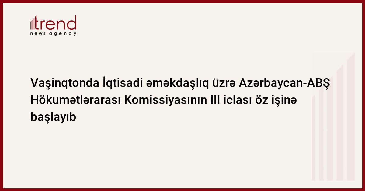 Çərşənbə günü Vaşinqtonda İqtisadi əməkdaşlıq üzrə Azərbaycan-ABŞ Hökumətlərarası Komissiyasının III iclası öz işinə başlayıb. Bu barədə Trend-ə Maliyyə Nazirliyinin mətbuat xidmətindən məlumat verilib.