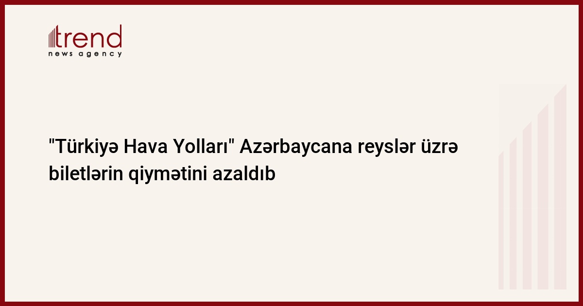 "Türkiyə Hava Yolları" İstanbuldan Azərbaycanın Bakı, Gəncə və Naxçıvan şəhərlərinə biletlərin qiymətini hər iki istiqamətdə 99 avroyadək aşağı salıb. Trend-in məlumatına görə, bu barədə aviaşirkətin çərşənbə axşamı yaydığı məlumatda deyilir.