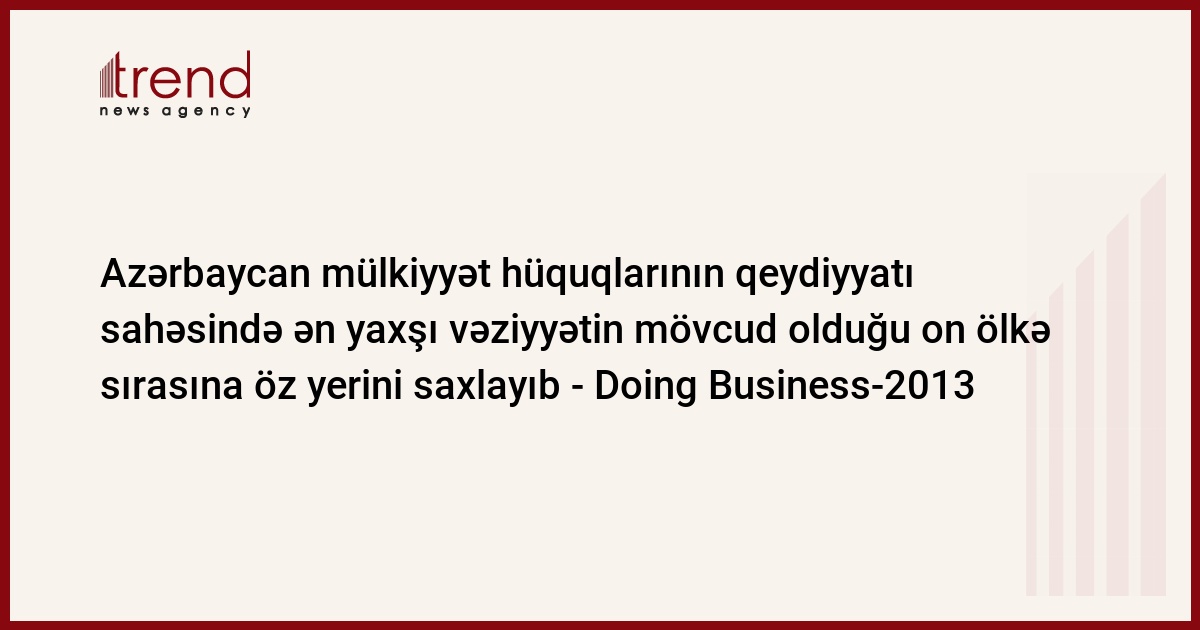 Azərbaycan Dünya Bankı (DB) və Beynəlxalq Maliyyə Korporasiyasının (IFC) Doing Business-2013 illik reytinqində mülkiyyət hüquqlarının qeydiyyatı sahəsində ən yaxşı vəziyyətin olduğu on ölkə arasında öz yerini qoruyub saxlayıb.