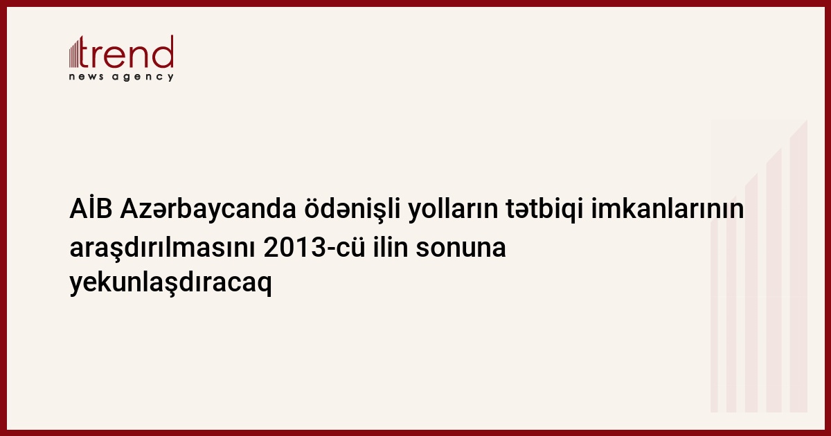 Asiya İnkişaf Bankı (AİB) Azərbaycanda ödənişli yolların tətbiqi imkanlarının öyrənilməsi məqsədilə araşdırma aparacaq. Trend-in məlumatına görə, bu barədə cümə axşamı bankın ölkədəki nümayəndəliyinin rəhbəri Olli Noroyono mətbuat konfransında deyib.