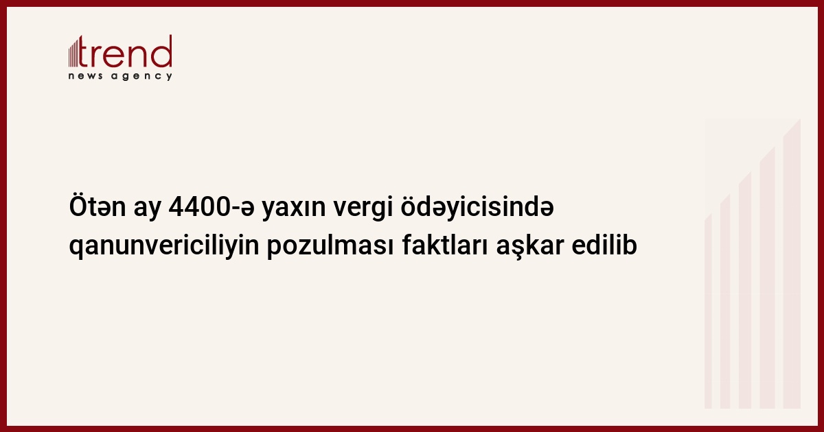 Vergilər Nazirliyinin Analitik-informasiya şöbəsindən Trend-ə verilən məlumata görə, 2226 vergi ödəyicisi tərəfindən nağd hesablaşmaların aparılması qaydalarının pozulduğu, 439 vergi ödəyicisi tərəfindən qanunla nəzərdə tutulmayan valyutanın ödəniş vasitəsi kimi qəbul olunduğu, valyutanın ticarət, iaşə və xidmət müəssisələrində qanunsuz olaraq alınıb-satıldığı və ya dəyişdirildiyi, 222 vergi ödəyicisinin vergi orqanlarında uçota durmadan fəaliyyət göstərdiyi, 716 vergi ödəyicisinin xüsusi razılıq (lisenziya) tələb olunan fəaliyyət növləri ilə belə razılıq (lisenziya) almadan məşğul olduğu müəyyən edilib.