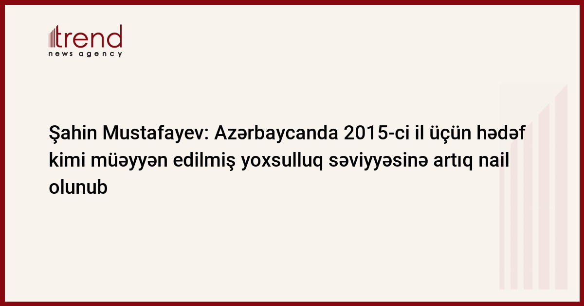 Azərbaycanda 2015-ci il üçün hədəf kimi müəyyən edilmiş yoxsulluq səviyyəsinə artıq nail olunub. Trend-in məlumatına görə, bunu Azərbaycan hökuməti və Birləşmiş Millətlər Təşkilatının 2015-ci ildən sonrakı dövr üçün milli məsləhətləşmələrin nəticələri ilə bağlı keçirdiyi konfransda çıxışı zamanı Azərbaycanın iqtisadi inkişaf naziri Şahin Mustafayev deyib.