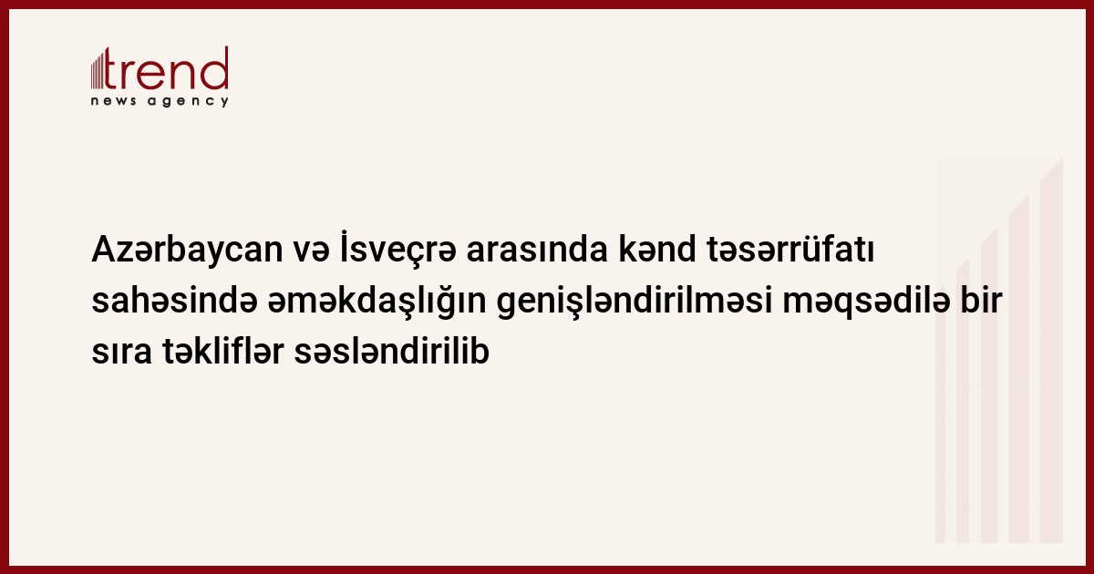 - iki ölkə arasında kənd təsərrüfatı sahəsində əməkdaşlığın müqavilə hüquq bazasını yaratmaq məqsədilə "Azərbaycan Respublikasının Kənd Təsərrüfatı Nazirliyi və İsveçrənin müvafiq dövlət qurumu arasında əməkdaşlığa dair Anlaşma Memorandumu"nun hazırlanması imkanlarının araşdırılması;